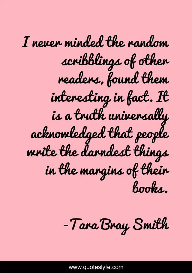 This page presents the quote "I never minded the random scribblings of other readers, found them interesting in fact. It is a truth universally acknowledged that people write the darndest things in the margins of their books.". Author of this quote is Tara Bray Smith. This quote is about margins, books, paraphrased, marginalia, readers,.