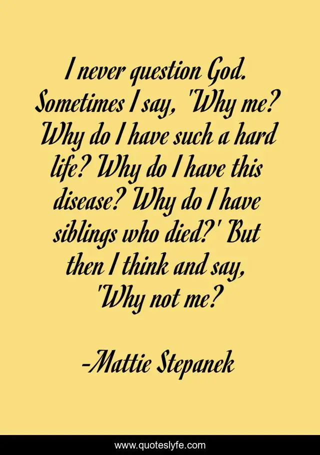 This page presents the quote "I never question God. Sometimes I say, 'Why me? Why do I have such a hard life? Why do I have this disease? Why do I have siblings who died?' But then I think and say, 'Why not me?". Author of this quote is Mattie Stepanek. This quote is about why-me, health,.