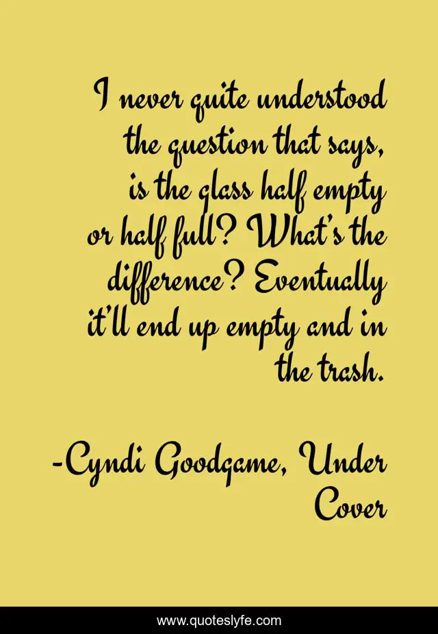 This page presents the quote "I never quite understood the question that says, is the glass half empty or half full? What’s the difference? Eventually it’ll end up empty and in the trash.". Author of this quote is Cyndi Goodgame, Under Cover. This quote is about ya, advice, philosophy, paranormal, cyndi-goodgame,.