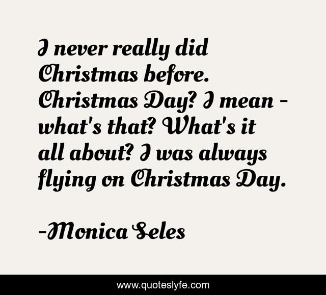 This page presents the quote "I never really did Christmas before. Christmas Day? I mean - what's that? What's it all about? I was always flying on Christmas Day.". Author of this quote is Monica Seles. This quote is about flying, day, mean,.