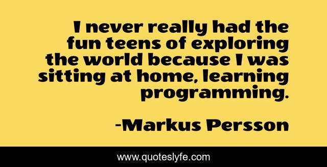 This page presents the quote "I never really had the fun teens of exploring the world because I was sitting at home, learning programming.". Author of this quote is Markus Persson. This quote is about fun, home, world,.