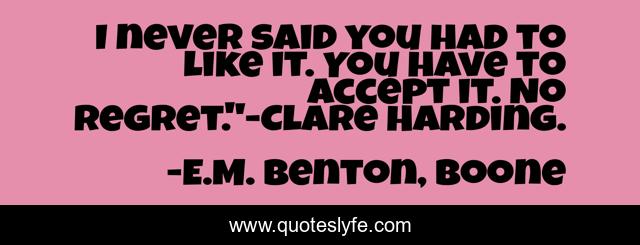 This page presents the quote "I never said you had to like it. You have to accept it. No regret."-Clare Harding.". Author of this quote is E.M. Benton, Boone. This quote is about scary, humor, horror, paranormal, campy-horror, supernatural, witches, fiction,.
