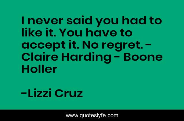 This page presents the quote "I never said you had to like it. You have to accept it. No regret. - Claire Harding - Boone Holler". Author of this quote is Lizzi Cruz. This quote is about horror, paranormal, fiction, campy, books, supernatural, witches,.