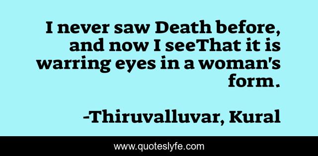 This page presents the quote "I never saw Death before, and now I seeThat it is warring eyes in a woman's form.". Author of this quote is Thiruvalluvar, Kural. This quote is about death, woman, love, affection,.