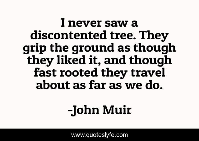 This page presents the quote "I never saw a discontented tree. They grip the ground as though they liked it, and though fast rooted they travel about as far as we do.". Author of this quote is John Muir. This quote is about travel, tree, fast,.