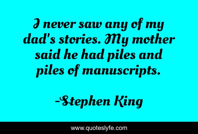 This page presents the quote "I never saw any of my dad's stories. My mother said he had piles and piles of manuscripts.". Author of this quote is Stephen King. This quote is about said, mother,.