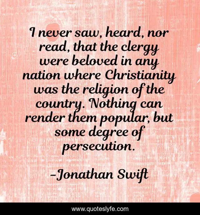 This page presents the quote "I never saw, heard, nor read, that the clergy were beloved in any nation where Christianity was the religion of the country. Nothing can render them popular, but some degree of persecution.". Author of this quote is Jonathan Swift. This quote is about nothing, country, nation,.