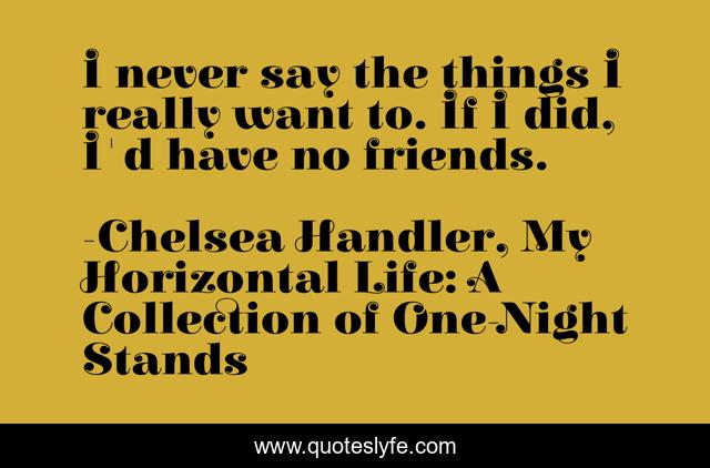 This page presents the quote "I never say the things I really want to. If I did, I'd have no friends.". Author of this quote is Chelsea Handler, My Horizontal Life: A Collection of One-Night Stands. This quote is about tact, friendship, humor, honesty, filters,.