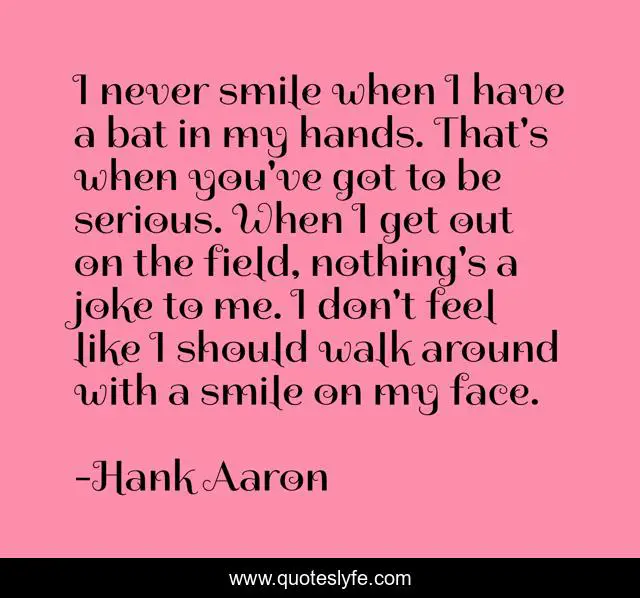 This page presents the quote "I never smile when I have a bat in my hands. That's when you've got to be serious. When I get out on the field, nothing's a joke to me. I don't feel like I should walk around with a smile on my face.". Author of this quote is Hank Aaron. .