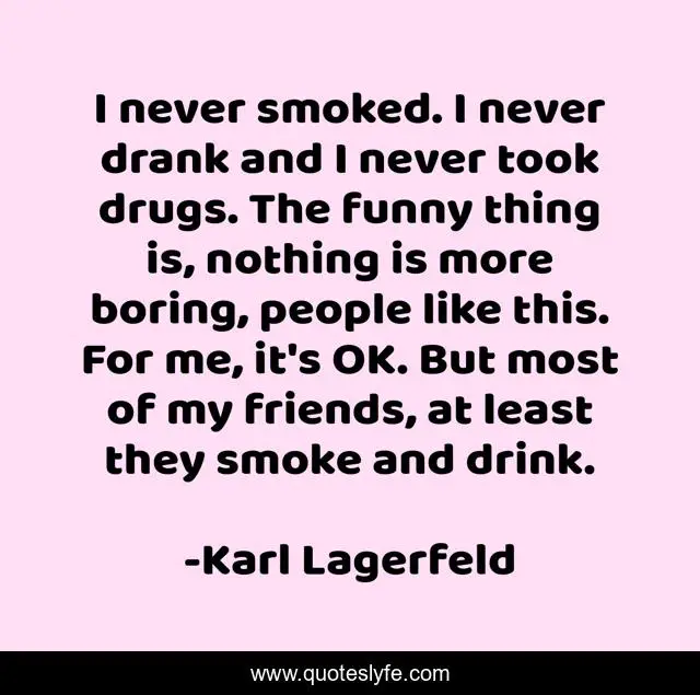 This page presents the quote "I never smoked. I never drank and I never took drugs. The funny thing is, nothing is more boring, people like this. For me, it's OK. But most of my friends, at least they smoke and drink.". Author of this quote is Karl Lagerfeld. This quote is about me, friends, people,.