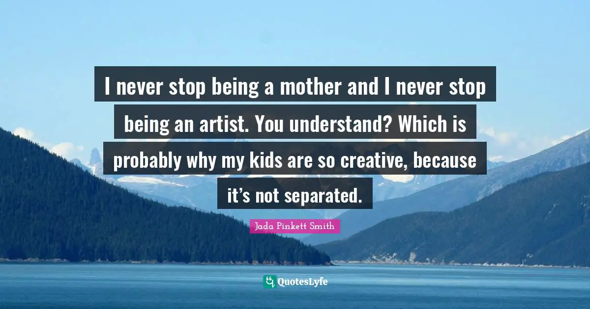 This page presents the quote "I never stop being a mother and I never stop being an artist. You understand? Which is probably why my kids are so creative, because it’s not separated.". Author of this quote is Jada Pinkett Smith. This quote is about creative, mother, being a mother, kids, being an artist, artist,.