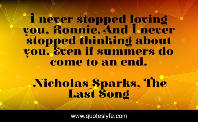 This page presents the quote "I never stopped loving you, Ronnie. And I never stopped thinking about you. Even if summers do come to an end.". Author of this quote is Nicholas Sparks, The Last Song. This quote is about love, family, affection,.