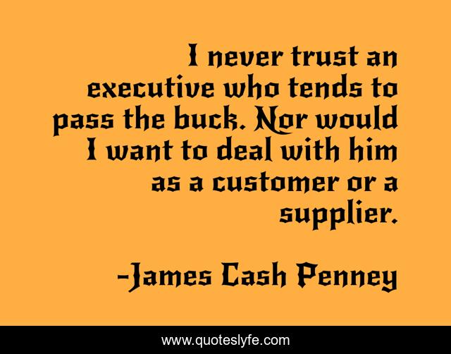 This page presents the quote "I never trust an executive who tends to pass the buck. Nor would I want to deal with him as a customer or a supplier.". Author of this quote is James Cash Penney. This quote is about customer, trust,.