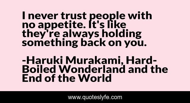 This page presents the quote "I never trust people with no appetite. It's like they're always holding something back on you.". Author of this quote is Haruki Murakami, Hard-Boiled Wonderland and the End of the World. This quote is about appetite, trust,.