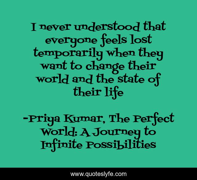 This page presents the quote "I never understood that everyone feels lost temporarily when they want to change their world and the state of their life". Author of this quote is Priya Kumar, The Perfect World: A Journey to Infinite Possibilities. This quote is about self-discovery, spiritual, self-exploration,.
