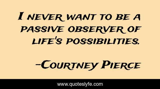 This page presents the quote "I never want to be a passive observer of life's possibilities.". Author of this quote is Courtney Pierce. This quote is about positive, confidence, motivational, adventure, optimistic,.