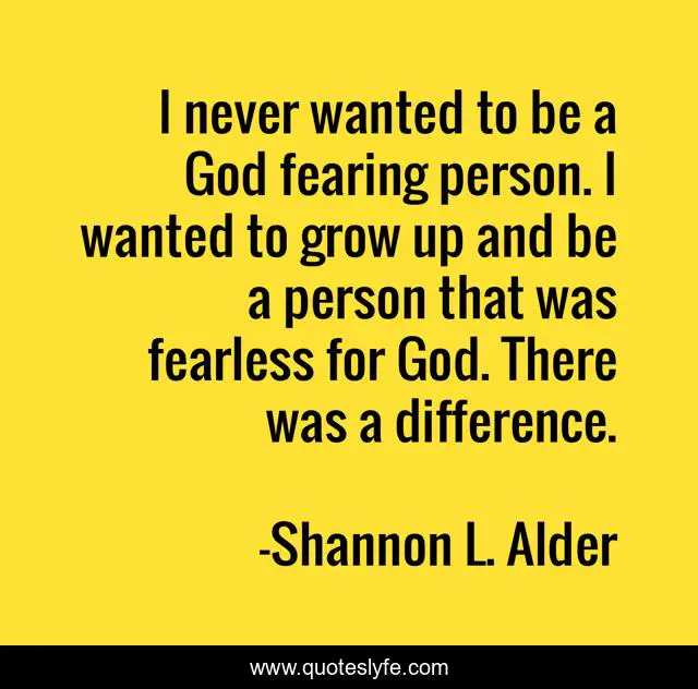 This page presents the quote "I never wanted to be a God fearing person. I wanted to grow up and be a person that was fearless for God. There was a difference.". Author of this quote is Shannon L. Alder. This quote is about trust, warrior, promptings, follow-your-heart, god-fearing, service, joy, fearless, follow-signs,.