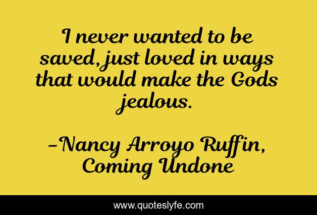 This page presents the quote "I never wanted to be saved, just loved in ways that would make the Gods jealous.". Author of this quote is Nancy Arroyo Ruffin, Coming Undone. This quote is about love, coming-undone, writer, poetry, love-poems, latina, boricua, affection,.
