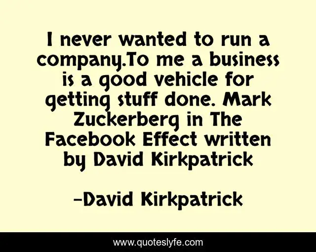 This page presents the quote "I never wanted to run a company.To me a business is a good vehicle for getting stuff done. Mark Zuckerberg in The Facebook Effect written by David Kirkpatrick". Author of this quote is David Kirkpatrick. .