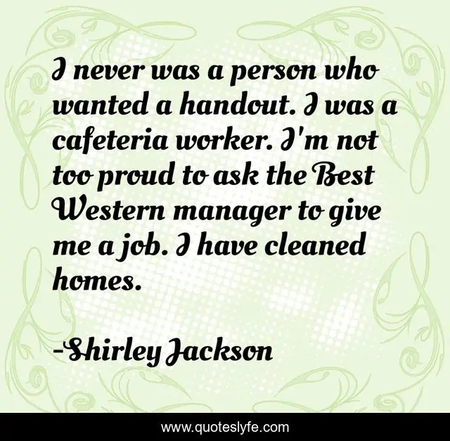 This page presents the quote "I never was a person who wanted a handout. I was a cafeteria worker. I'm not too proud to ask the Best Western manager to give me a job. I have cleaned homes.". Author of this quote is Shirley Jackson. This quote is about me, job, proud,.