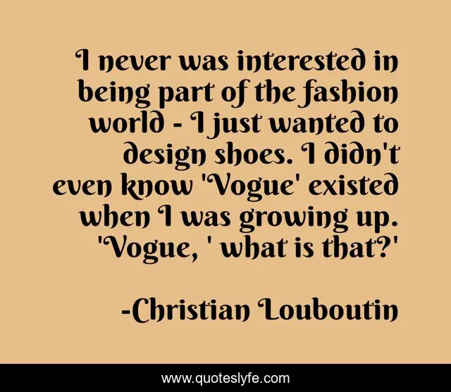 This page presents the quote "I never was interested in being part of the fashion world - I just wanted to design shoes. I didn't even know 'Vogue' existed when I was growing up. 'Vogue, ' what is that?'". Author of this quote is Christian Louboutin. This quote is about world, growing up, shoes,.