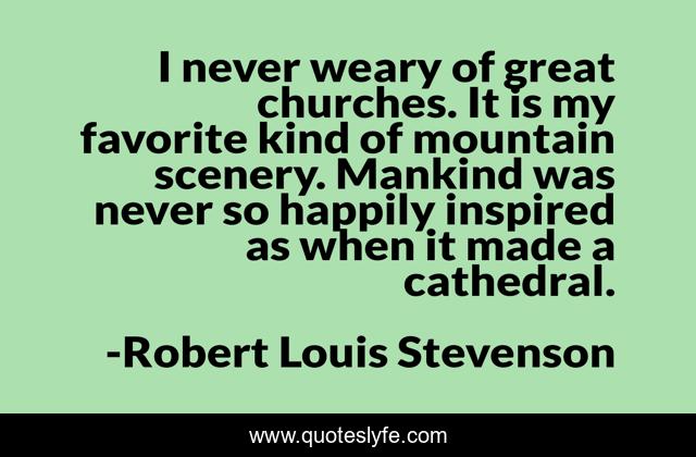 This page presents the quote "I never weary of great churches. It is my favorite kind of mountain scenery. Mankind was never so happily inspired as when it made a cathedral.". Author of this quote is Robert Louis Stevenson. This quote is about scenery, mountain, favorite,.