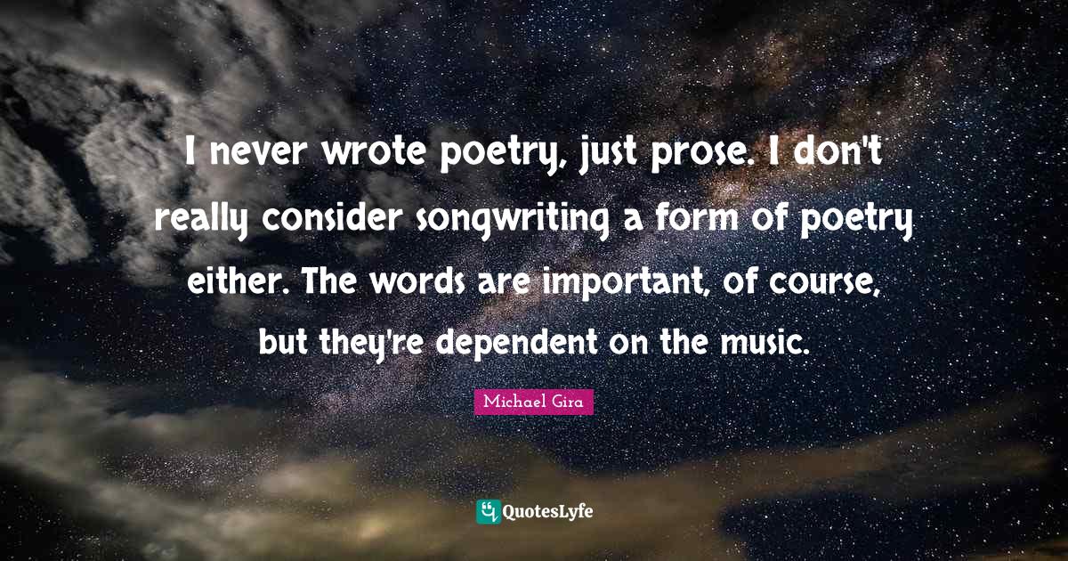 This page presents the quote "I never wrote poetry, just prose. I don't really consider songwriting a form of poetry either. The words are important, of course, but they're dependent on the music.". Author of this quote is Michael Gira. This quote is about important, dependent, form, songwriting, poetry, prose, music,.