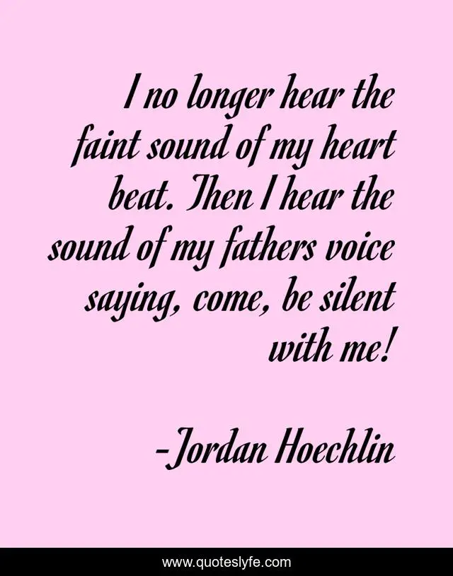This page presents the quote "I no longer hear the faint sound of my heart beat. Then I hear the sound of my fathers voice saying, come, be silent with me!". Author of this quote is Jordan Hoechlin. .