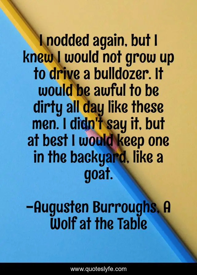 This page presents the quote "I nodded again, but I knew I would not grow up to drive a bulldozer. It would be awful to be dirty all day like these men. I didn't say it, but at best I would keep one in the backyard, like a goat.". Author of this quote is Augusten Burroughs, A Wolf at the Table. This quote is about aspirations, work, growing-up,.