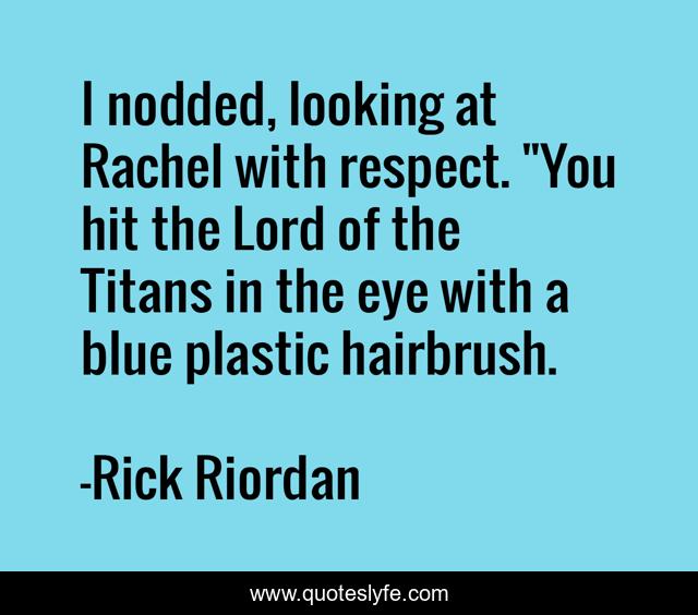 This page presents the quote "I nodded, looking at Rachel with respect. "You hit the Lord of the Titans in the eye with a blue plastic hairbrush.". Author of this quote is Rick Riordan. This quote is about rachel-elizabeth-dare, percy-jackson,.