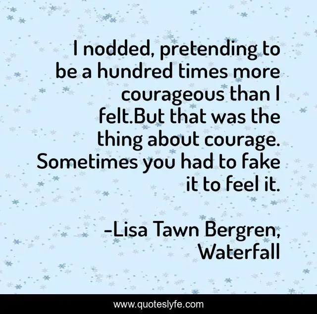 This page presents the quote "I nodded, pretending to be a hundred times more courageous than I felt.But that was the thing about courage. Sometimes you had to fake it to feel it.". Author of this quote is Lisa Tawn Bergren, Waterfall. This quote is about courage, waterfall, lisa-bergren,.