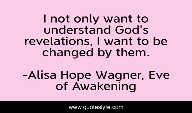 This page presents the quote "I not only want to understand God's revelations, I want to be changed by them.". Author of this quote is Alisa Hope Wagner, Eve of Awakening. This quote is about faith, growth, christianity, god, revelation,.