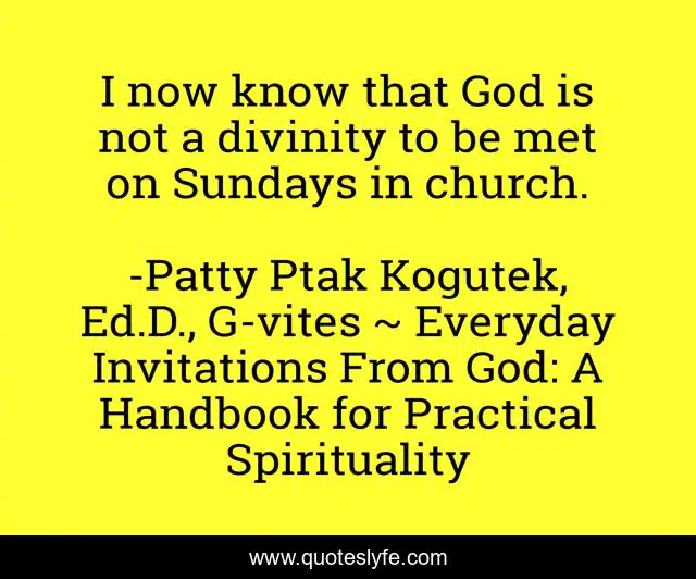 This page presents the quote "I now know that God is not a divinity to be met on Sundays in church.". Author of this quote is Patty Ptak Kogutek, Ed.D., G-vites ~ Everyday Invitations From God: A Handbook for Practical Spirituality. This quote is about enthusiasm, inspirational, christianity,.