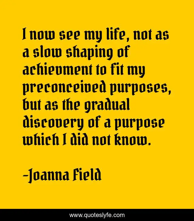 This page presents the quote "I now see my life, not as a slow shaping of achievment to fit my preconceived purposes, but as the gradual discovery of a purpose which I did not know.". Author of this quote is Joanna Field. This quote is about enthusiasm, growth, inspirational, life-lessons,.