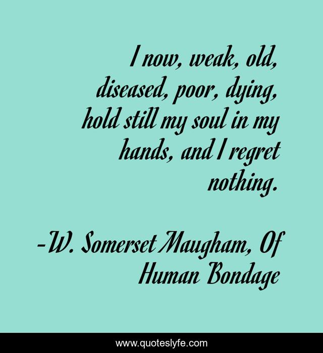 This page presents the quote "I now, weak, old, diseased, poor, dying, hold still my soul in my hands, and I regret nothing.". Author of this quote is W. Somerset Maugham, Of Human Bondage. This quote is about regret, soul,.