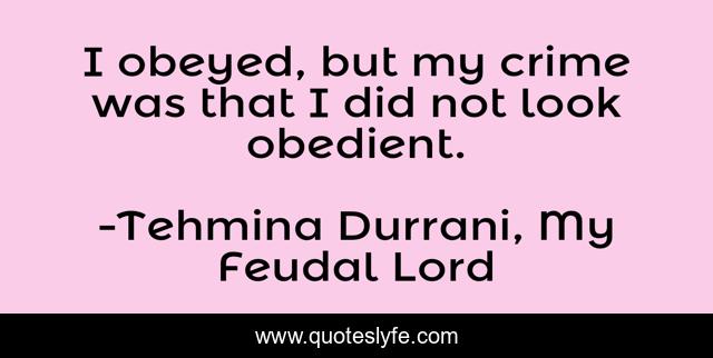 This page presents the quote "I obeyed, but my crime was that I did not look obedient.". Author of this quote is Tehmina Durrani, My Feudal Lord. This quote is about obeyed, obedient, obey, crime,.