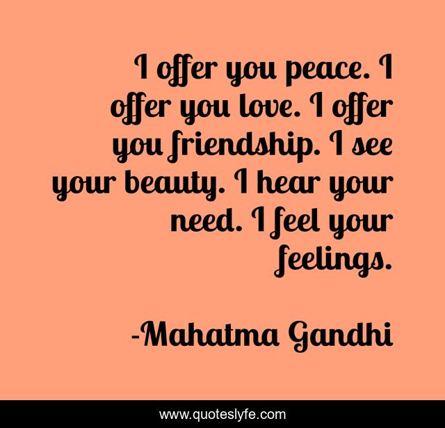 This page presents the quote "I offer you peace. I offer you love. I offer you friendship. I see your beauty. I hear your need. I feel your feelings.". Author of this quote is Mahatma Gandhi. This quote is about enthusiasm, inspirational,.