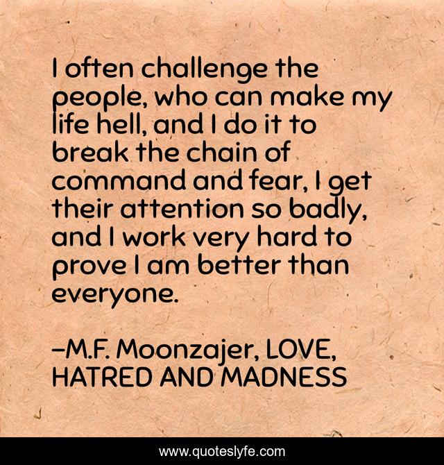 This page presents the quote "I often challenge the people, who can make my life hell, and I do it to break the chain of command and fear, I get their attention so badly, and I work very hard to prove I am better than everyone.". Author of this quote is M.F. Moonzajer, LOVE, HATRED AND MADNESS. This quote is about life, people, challenge, command, hell, fear,.