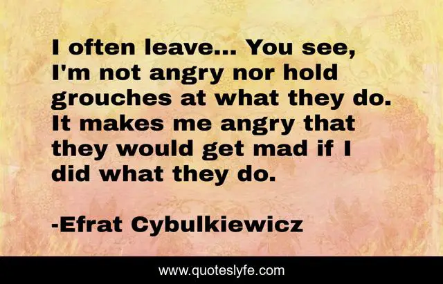 This page presents the quote "I often leave... You see, I'm not angry nor hold grouches at what they do. It makes me angry that they would get mad if I did what they do.". Author of this quote is Efrat Cybulkiewicz. This quote is about self-love, self-respect, self-awareness, grouches, letting-go, love, forgiveness, affection,.