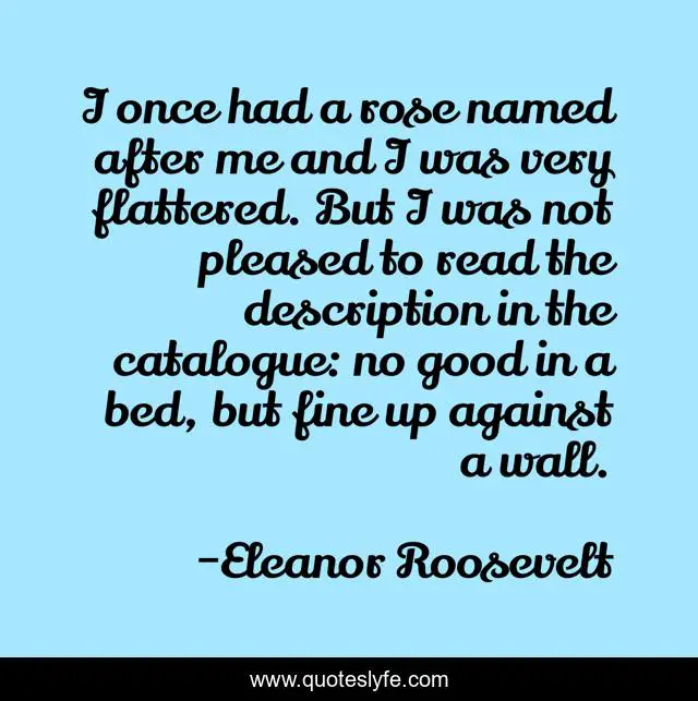 This page presents the quote "I once had a rose named after me and I was very flattered. But I was not pleased to read the description in the catalogue: no good in a bed, but fine up against a wall.". Author of this quote is Eleanor Roosevelt. This quote is about me, rose, fine,.