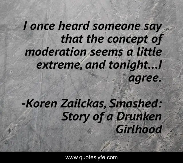 This page presents the quote "I once heard someone say that the concept of moderation seems a little extreme, and tonight...I agree.". Author of this quote is Koren Zailckas, Smashed: Story of a Drunken Girlhood. This quote is about moderation, alcohol,.