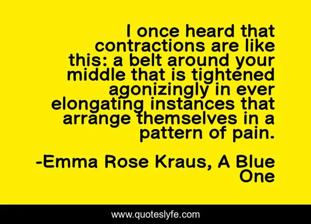 This page presents the quote "I once heard that contractions are like this: a belt around your middle that is tightened agonizingly in ever elongating instances that arrange themselves in a pattern of pain.". Author of this quote is Emma Rose Kraus, A Blue One. This quote is about confession, contractions, pain, birth, labor,.