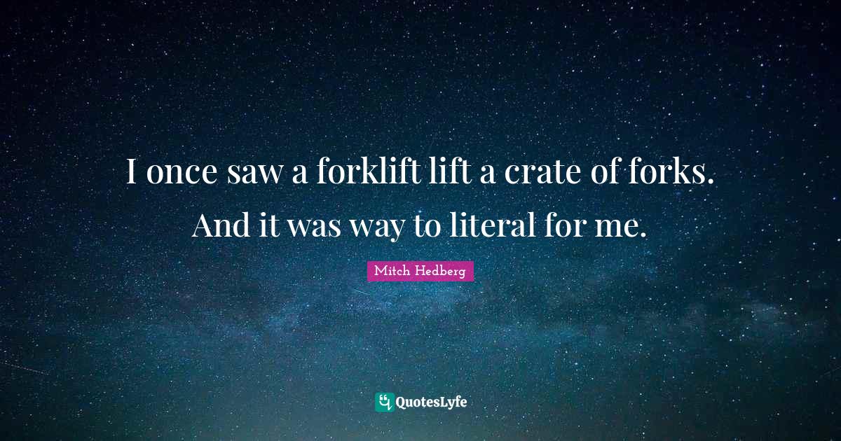 This page presents the quote "I once saw a forklift lift a crate of forks. And it was way to literal for me.". Author of this quote is Mitch Hedberg. This quote is about literal, way, funny, forks, humor,.
