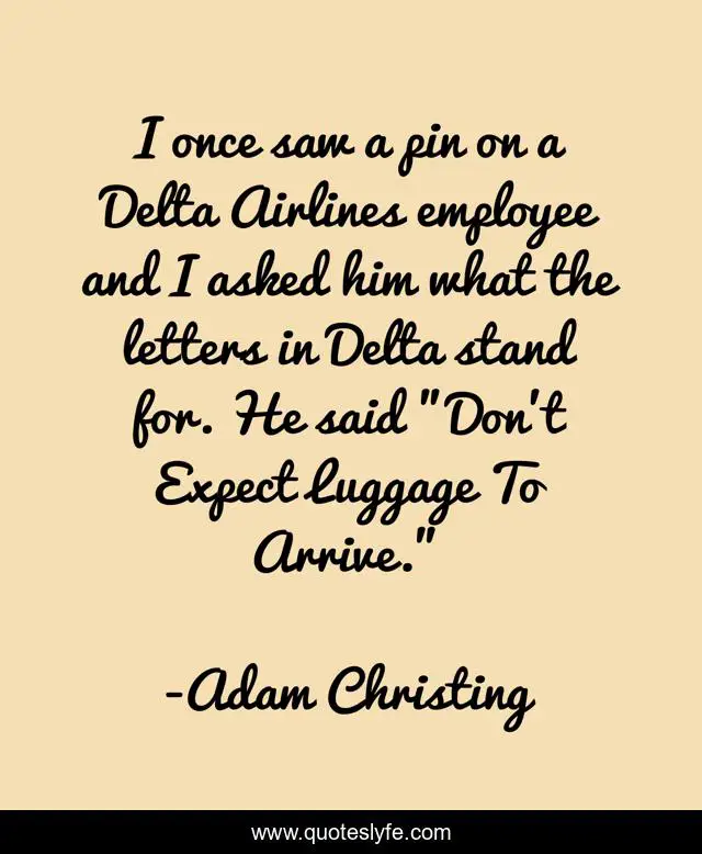This page presents the quote "I once saw a pin on a Delta Airlines employee and I asked him what the letters in Delta stand for. He said "Don't Expect Luggage To Arrive."". Author of this quote is Adam Christing. This quote is about travel, cities,.
