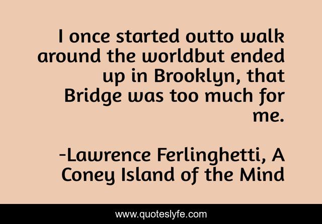 This page presents the quote "I once started outto walk around the worldbut ended up in Brooklyn, that Bridge was too much for me.". Author of this quote is Lawrence Ferlinghetti, A Coney Island of the Mind. .