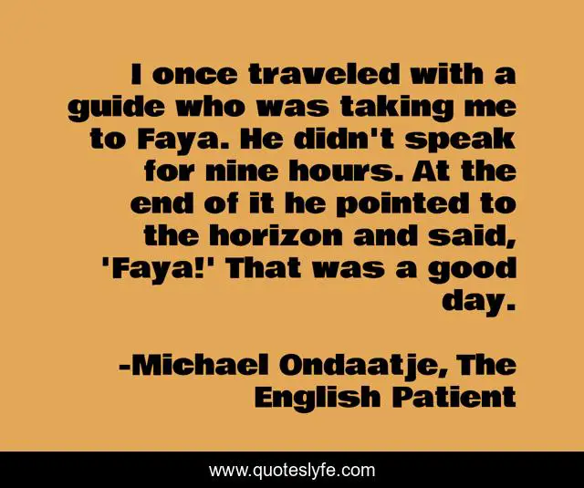 This page presents the quote "I once traveled with a guide who was taking me to Faya. He didn't speak for nine hours. At the end of it he pointed to the horizon and said, 'Faya!' That was a good day.". Author of this quote is Michael Ondaatje, The English Patient. .