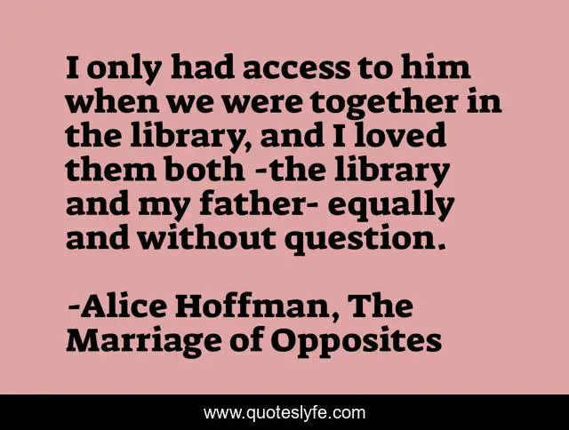 This page presents the quote "I only had access to him when we were together in the library, and I loved them both -the library and my father- equally and without question.". Author of this quote is Alice Hoffman, The Marriage of Opposites. This quote is about love, library, father-and-daughter, inspirational, enthusiasm, affection,.