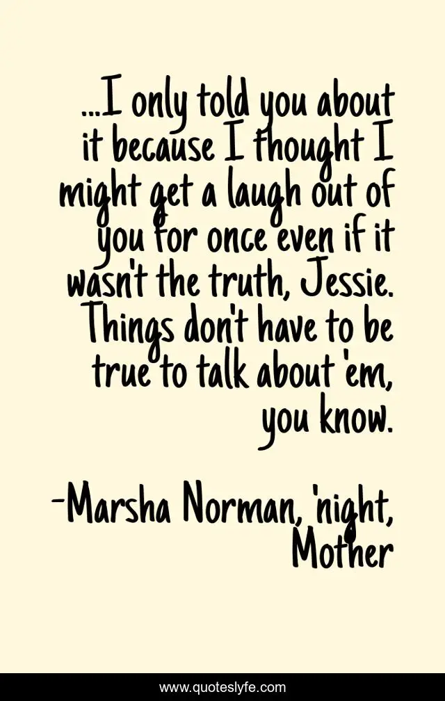 This page presents the quote "...I only told you about it because I thought I might get a laugh out of you for once even if it wasn't the truth, Jessie. Things don't have to be true to talk about 'em, you know.". Author of this quote is Marsha Norman, 'night, Mother. This quote is about conversation, talk, truth, talking,.