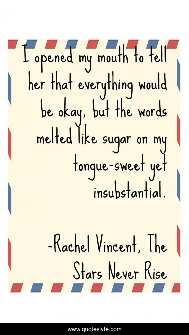This page presents the quote "I opened my mouth to tell her that everything would be okay, but the words melted like sugar on my tongue-sweet yet insubstantial.". Author of this quote is Rachel Vincent, The Stars Never Rise. This quote is about metaphor, sugar,.