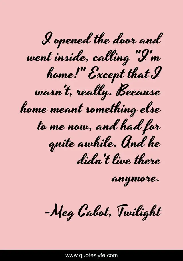 This page presents the quote "I opened the door and went inside, calling "I'm home!" Except that I wasn't, really. Because home meant something else to me now, and had for quite awhile. And he didn't live there anymore.". Author of this quote is Meg Cabot, Twilight. This quote is about home, love, affection,.